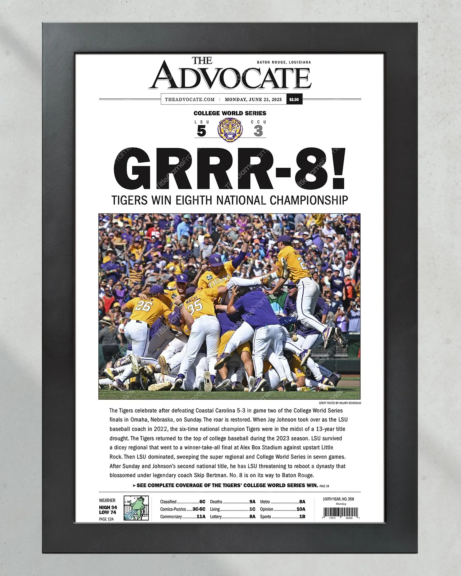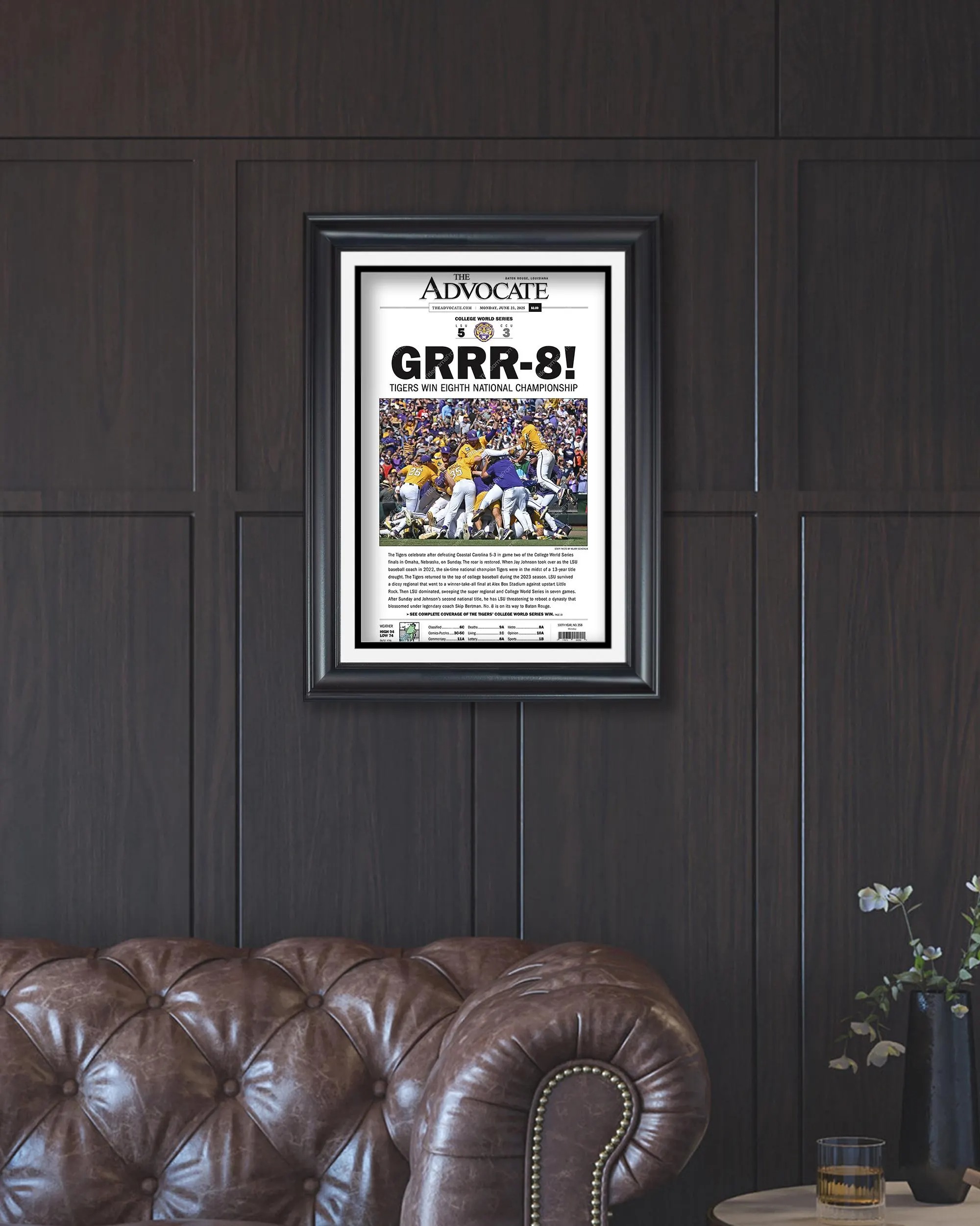2025 LSU Tigers GRRR-8! College World Series Champions Framed Newspaper