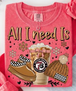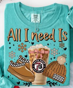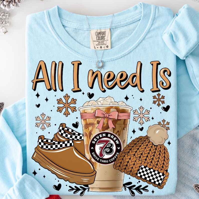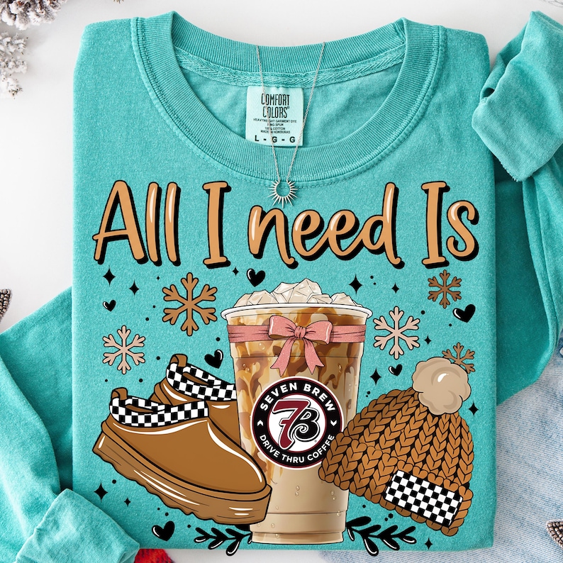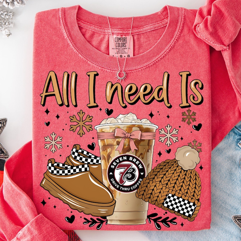All I Need Is 7 Brew Coffee Shirt, Cozy Winter Coffee Lover Shirt, Iced Latte Holiday Shirt, Iced Coffee Vibes, Coquette Bow Christmas 7 Brew