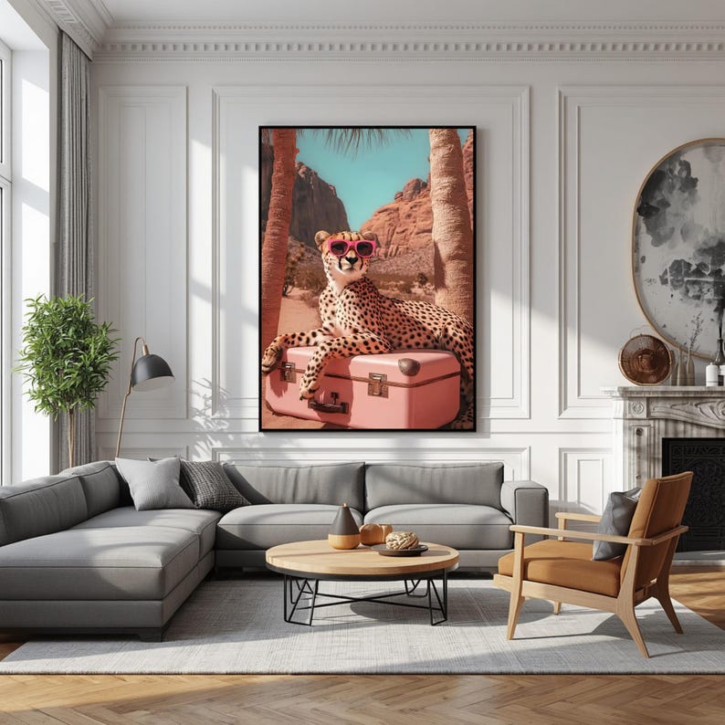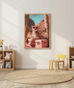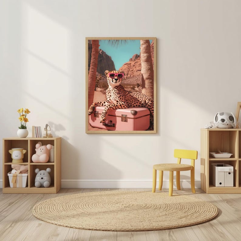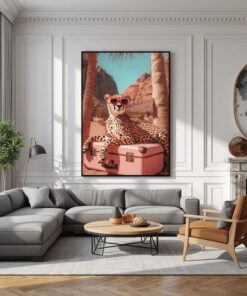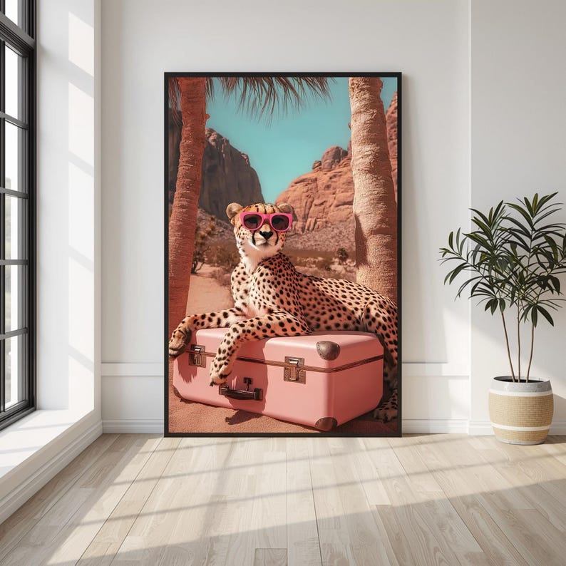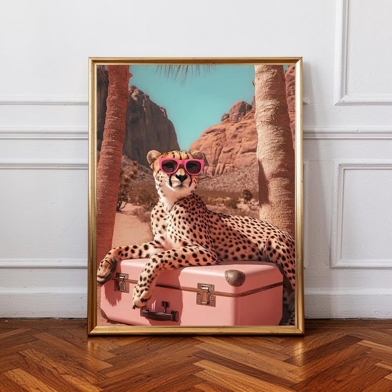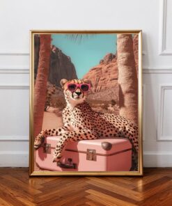 Be the first to review “Animal poster, Cheetah sunglasses wall art, desert animal print, pink suitcase poster, stylish leopard artwork, modern tropical travel decor”