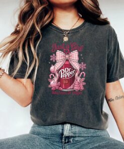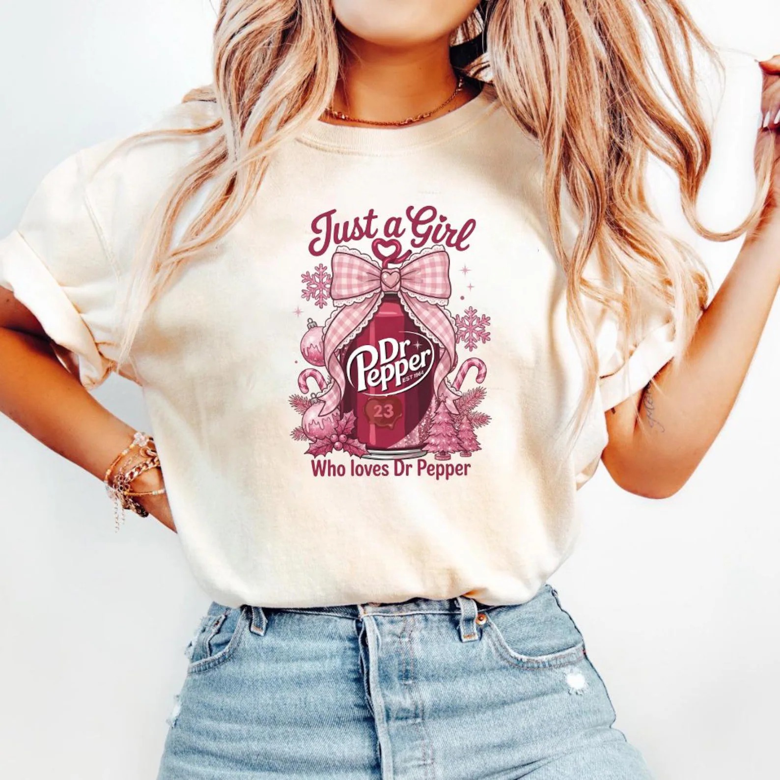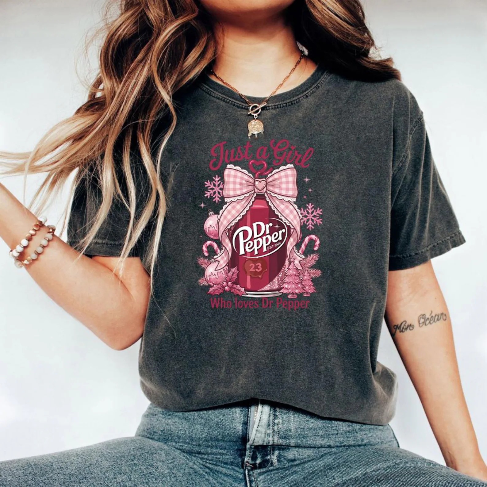 Dr Pepper T-Shirt, Just a Girl Who Loves Dr Pepper Tee, Bow and Roses Graphic Top, Funny Soda Shirt, Beverage Gift for Women