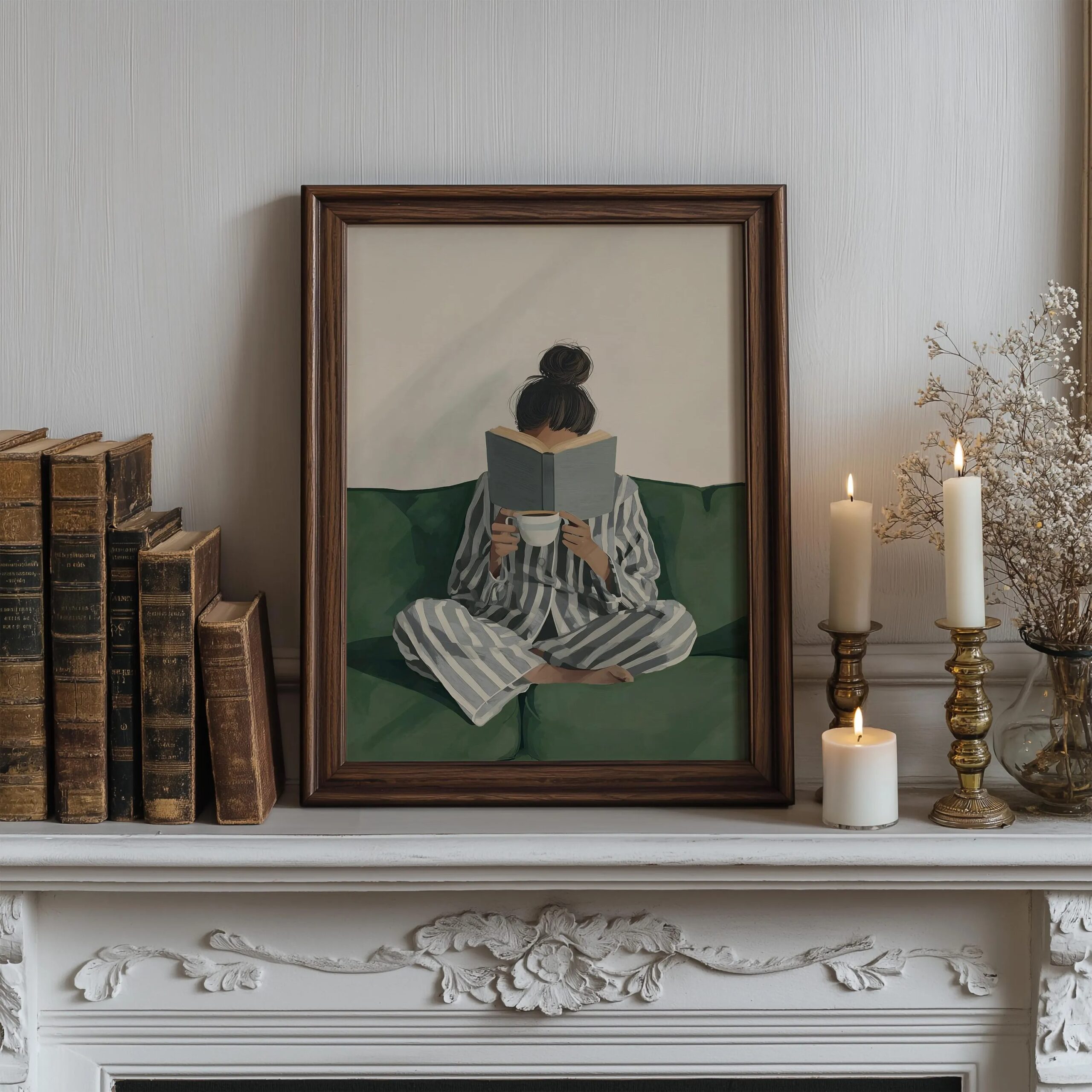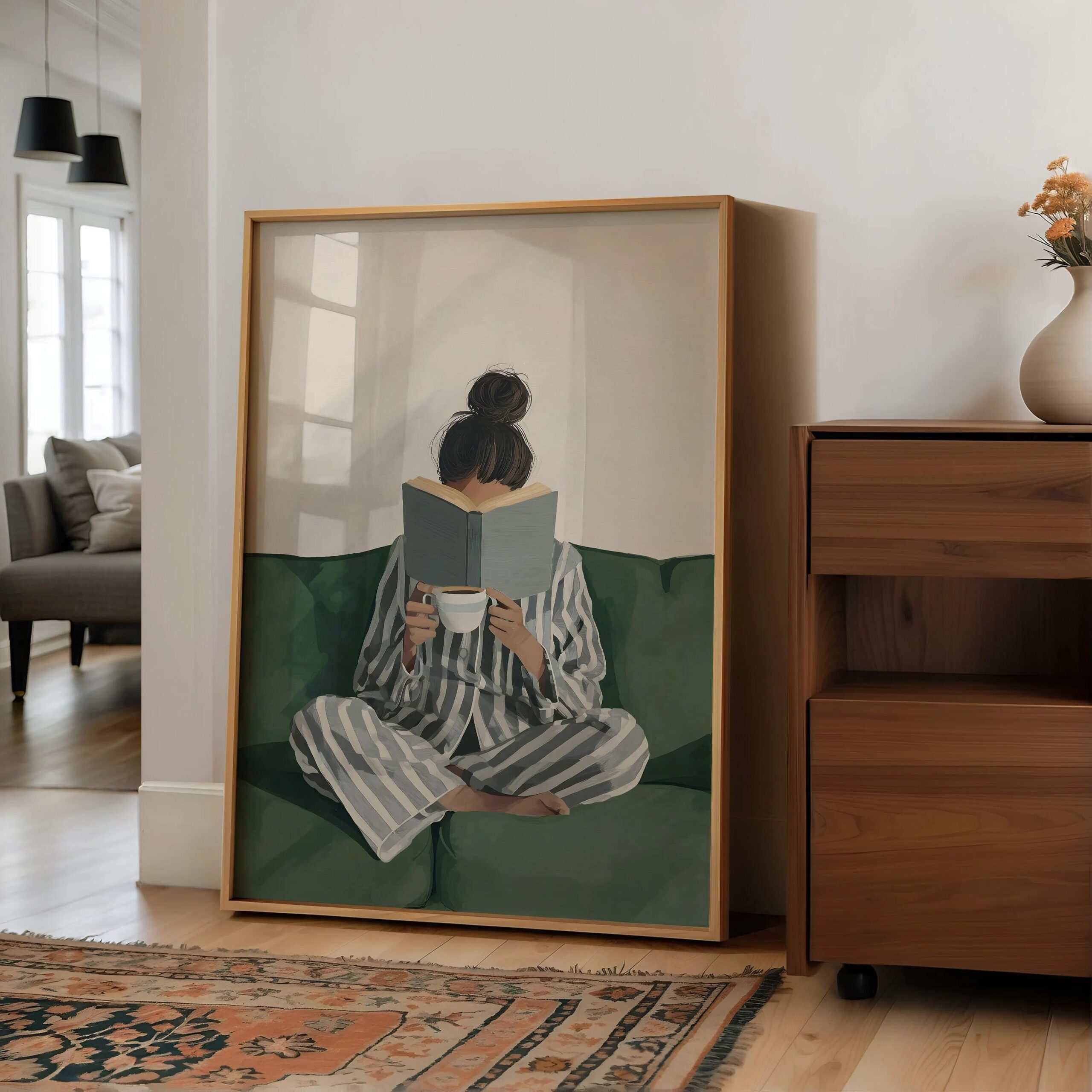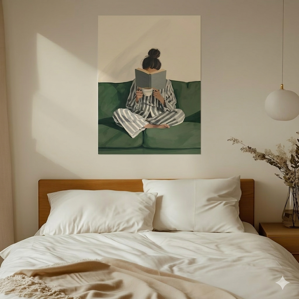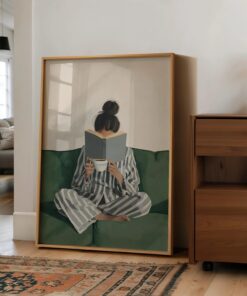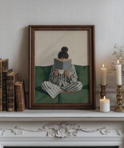 Emerald Green Woman Reading Poster, Aesthetic Reading Canvas, Bookish Wall Art for Living Room