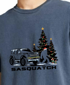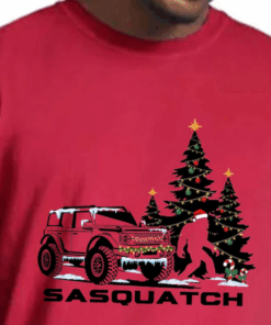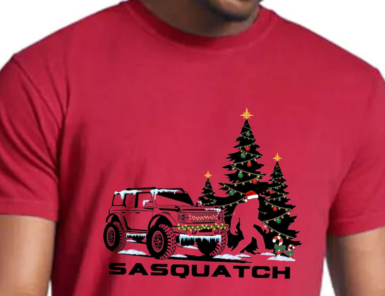 Ford Bronco Lover Christmas T-Shirt with Sasquatch Christmas Trees, Candy Cane Xmas Lights and Bronco Truck Printed on Shirt