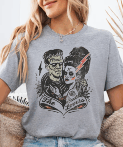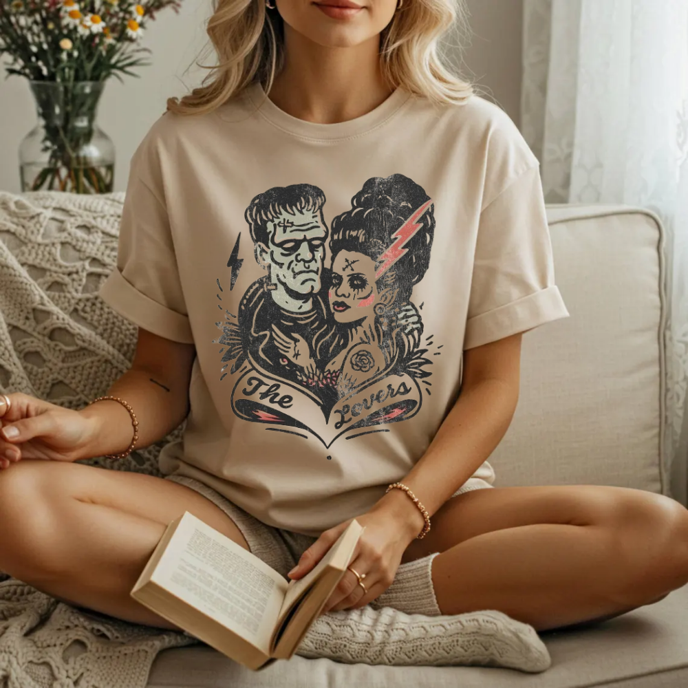Frankenstein & Frankenstein’s Bride “The Lovers” Tarot Cards Tattoo Style Shirt – Vintage Horror Couple Tee