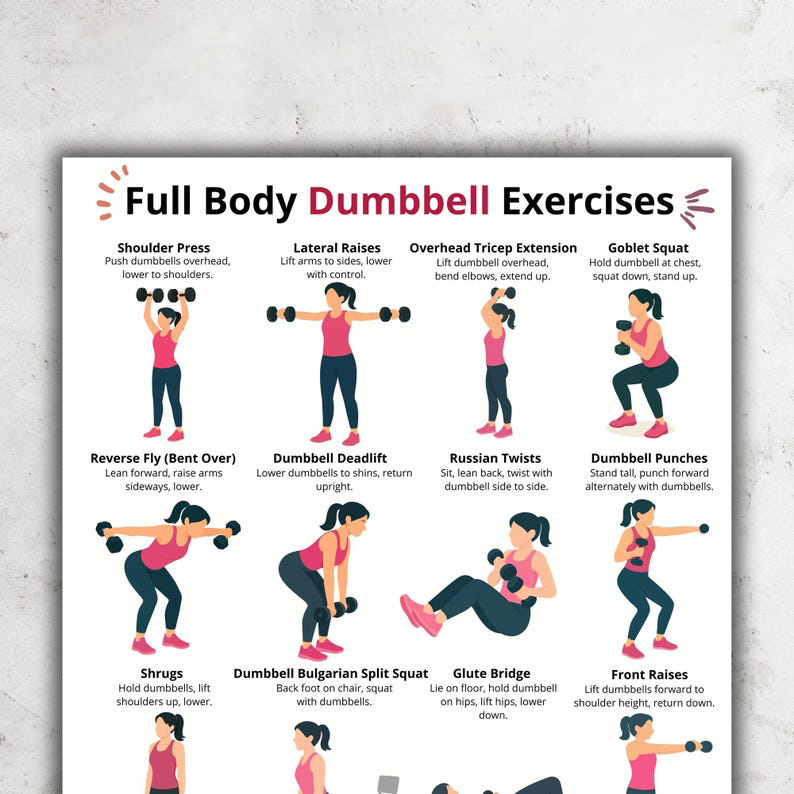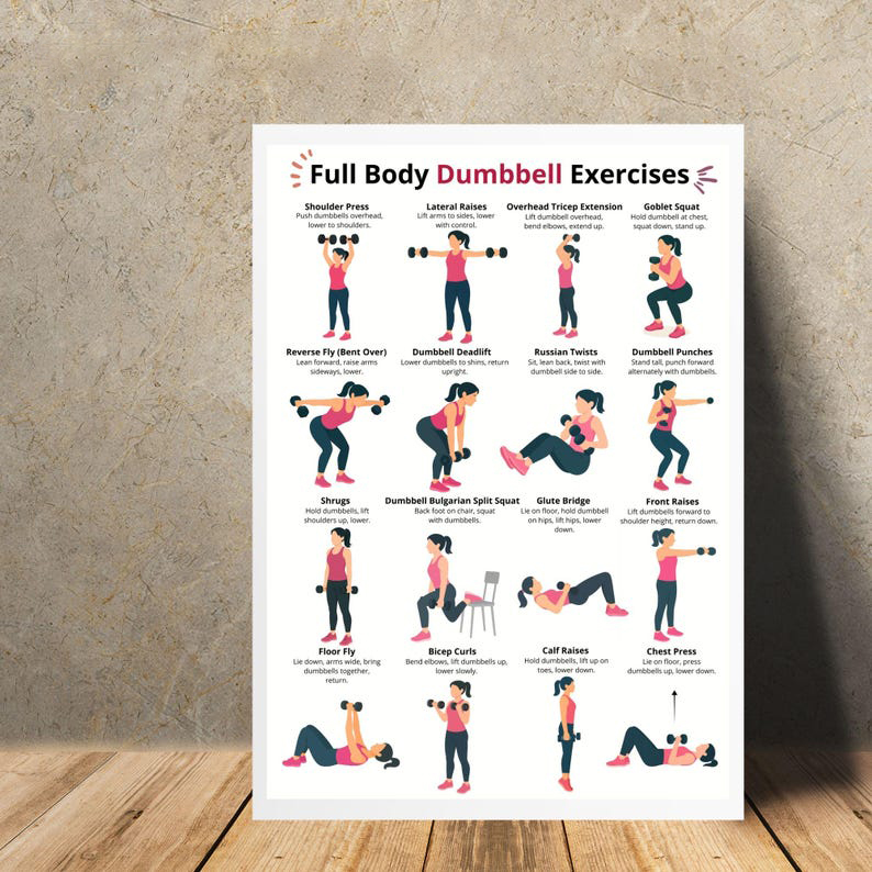 Full Body Dumbbell Workout Chart, Home Exercise Poster, Beginner Fitness Art