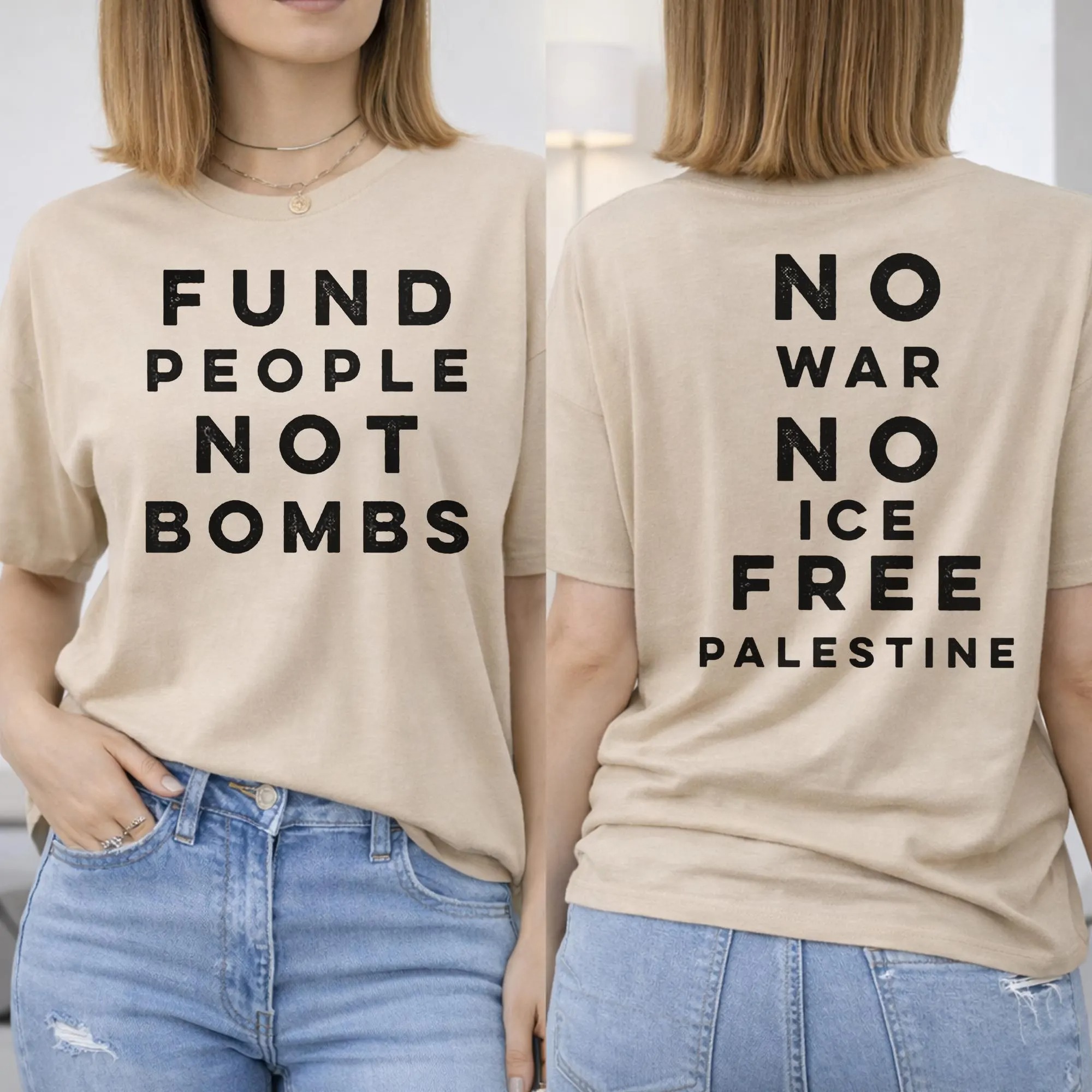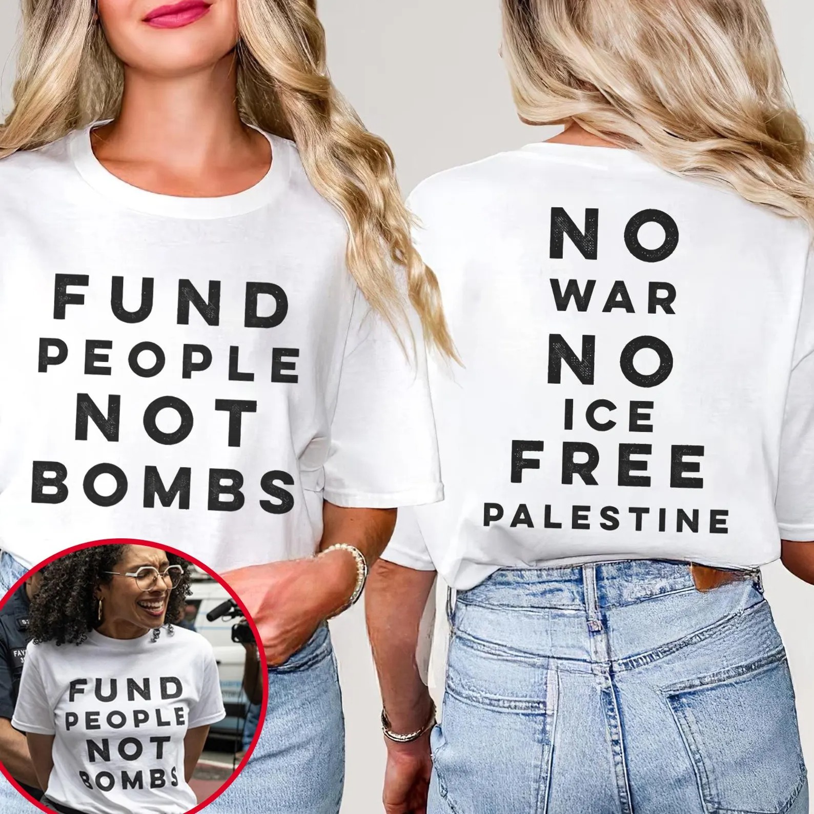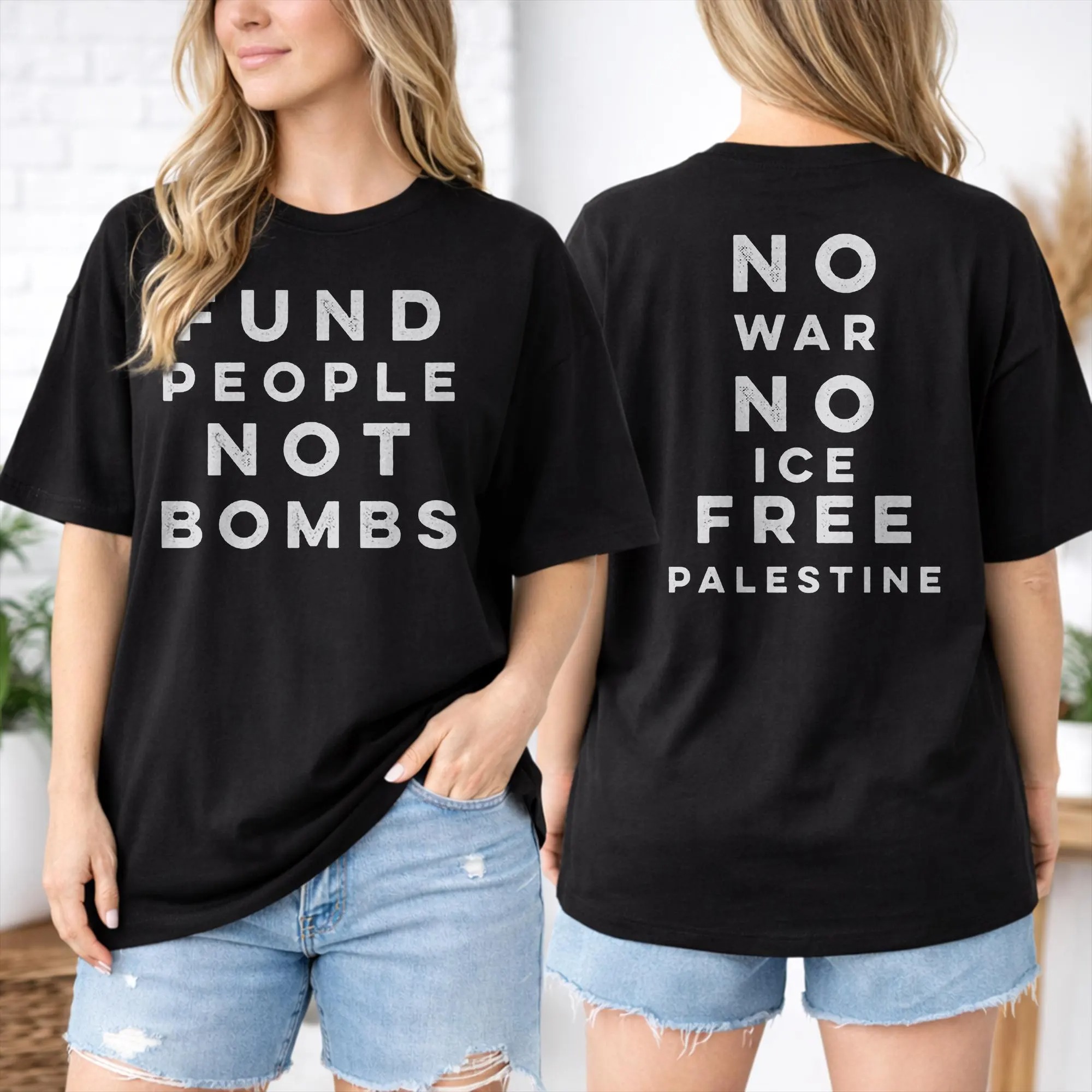 Fund People Not Bombs T-Shirt 2 Sided, Free Palestine Shirts, No War No Ice Tee