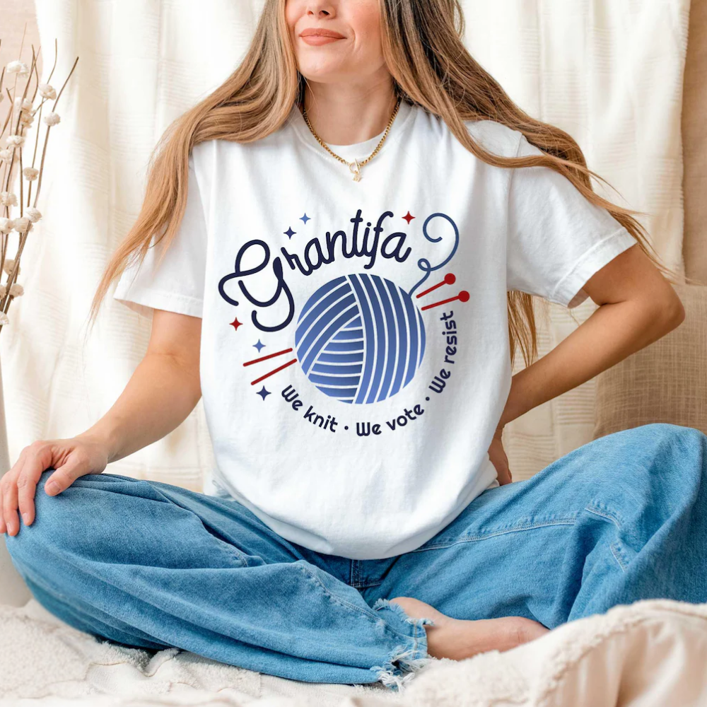 GRANTIFA Anti Fascist Grandma T-Shirt, Feminist Elder Millennial Tee, Funny Political Statement Gift for Grandmillennial FDT Activist Knitter