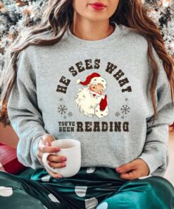He Sees What You’ve Been Reading Santa Sweatshirt, Funny Bookish Christmas Santa T-Shirt, Book Lover Gift, Xmas Hoodie, Gift For Her