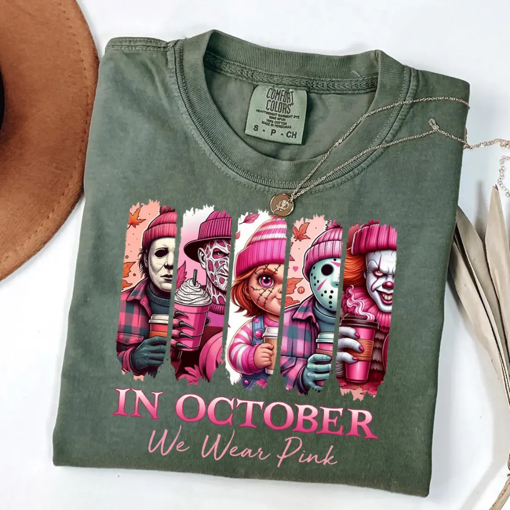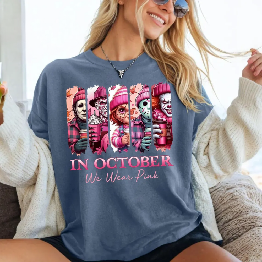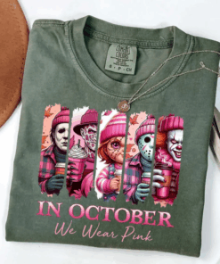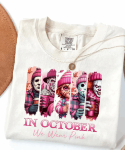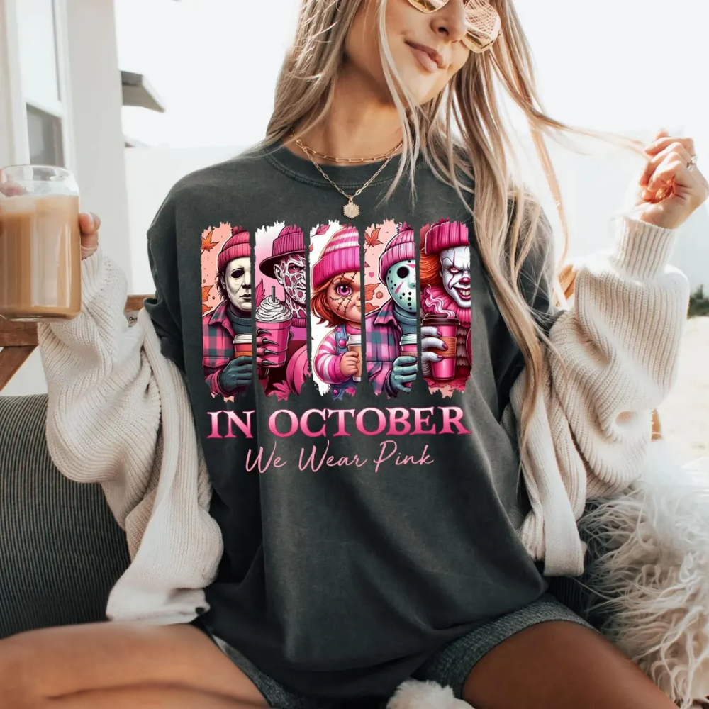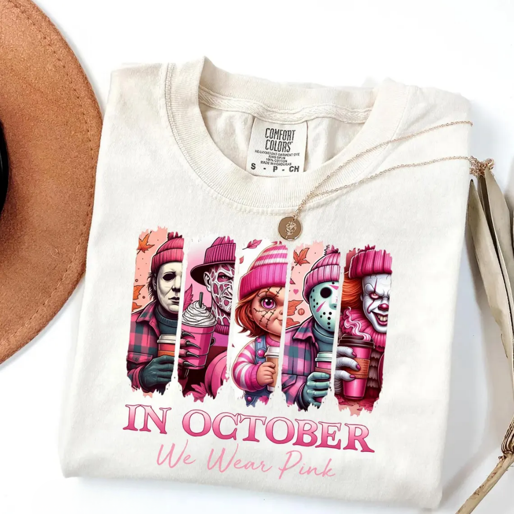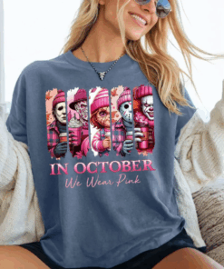 In October We Wear Pink Tshirt, Friends Horror Sweatshirt, Horror Movie Killers, Pink Ribbon Shirt, Breast Cancer Halloween
