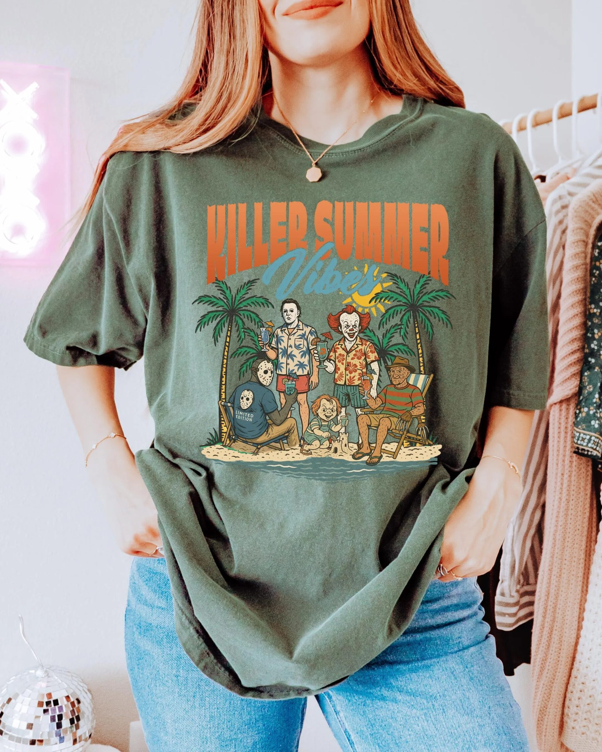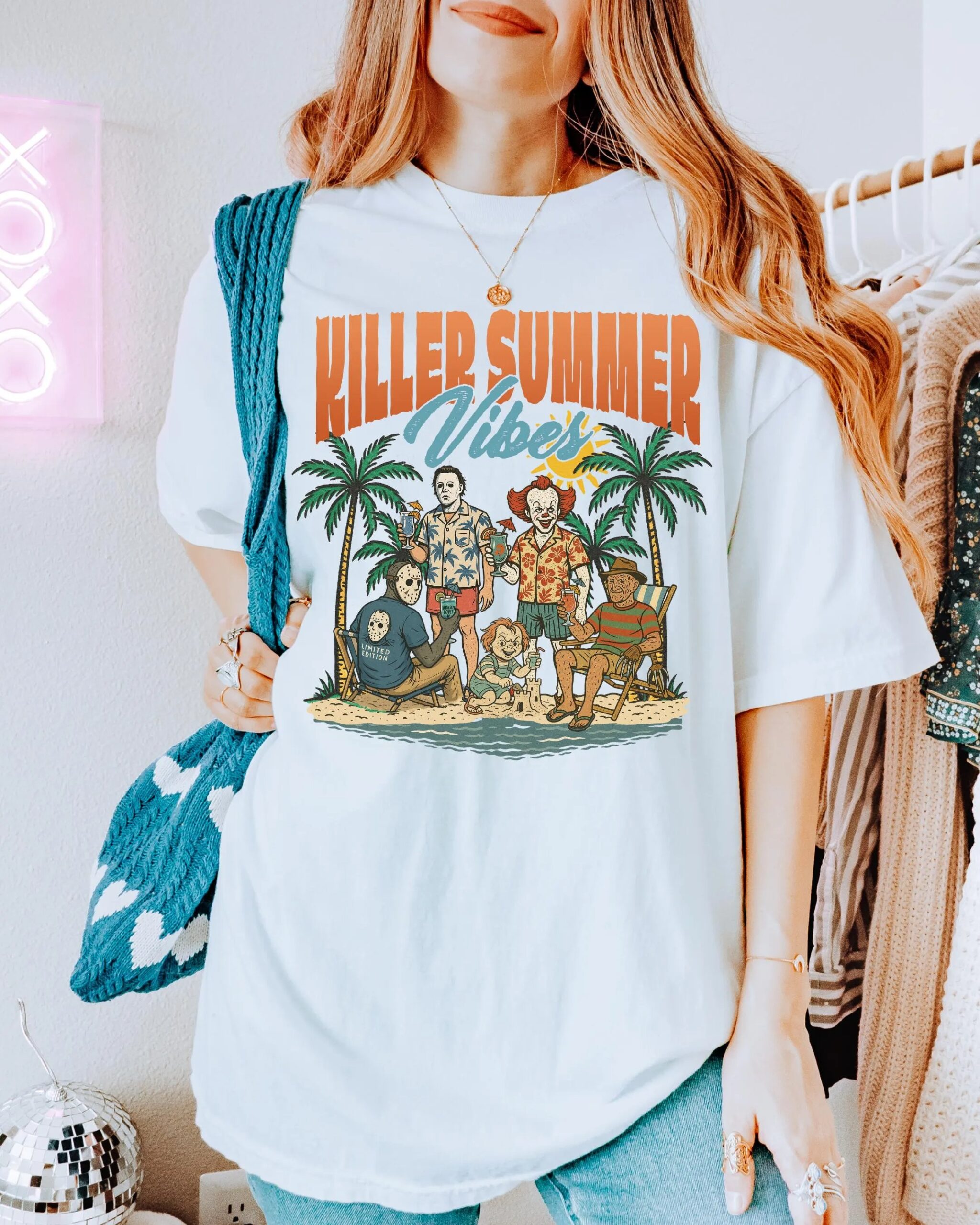 Killers Summer Vibes Shirt, Horror Characters Tee, Funny Horror Summer T-Shirt, Horror’s Vacation, Summerween, Summer Vacation