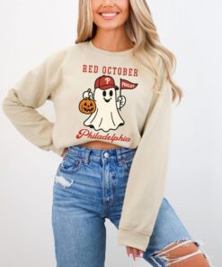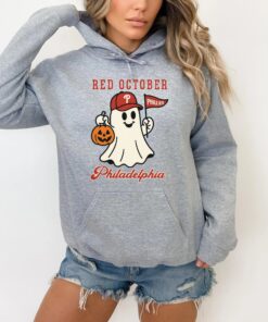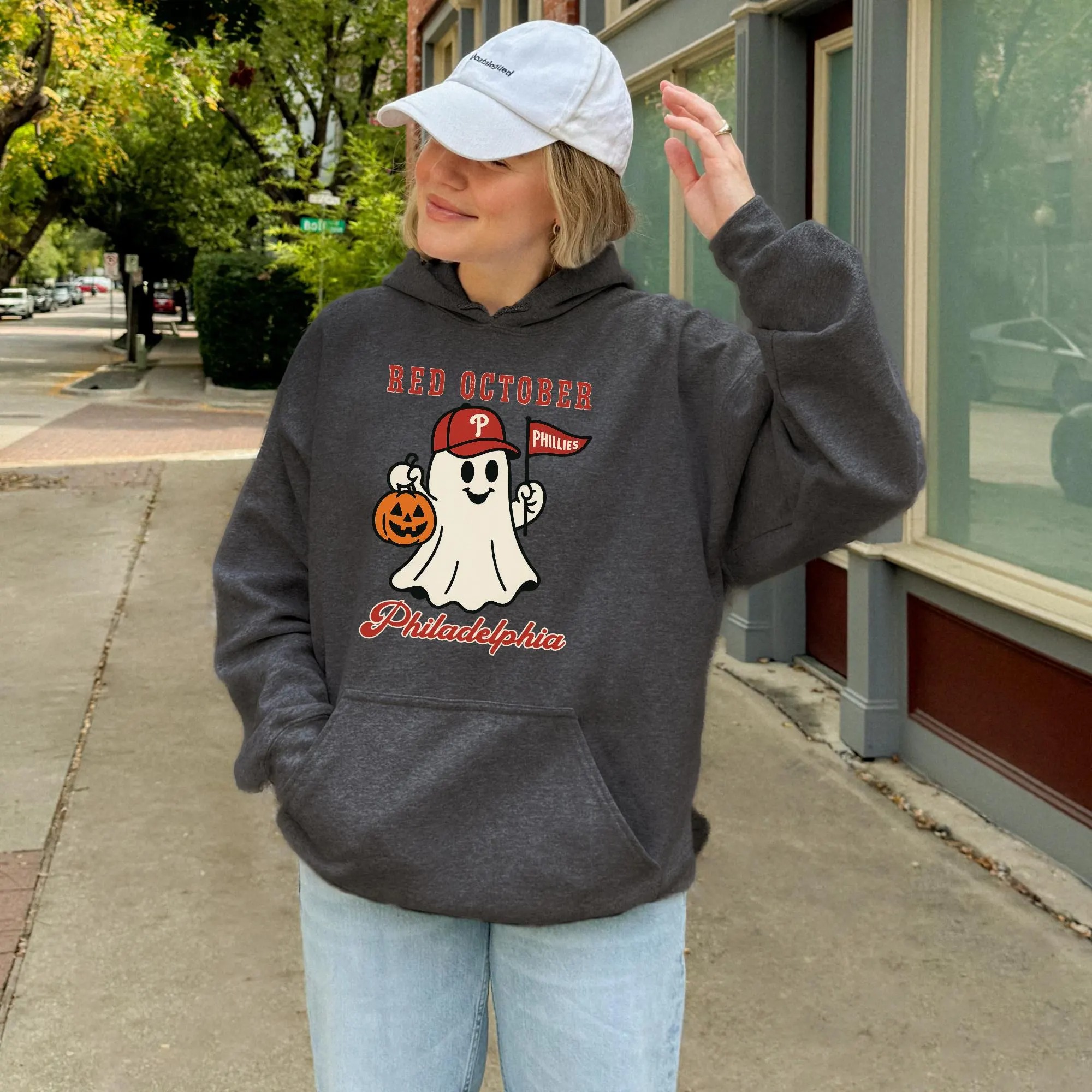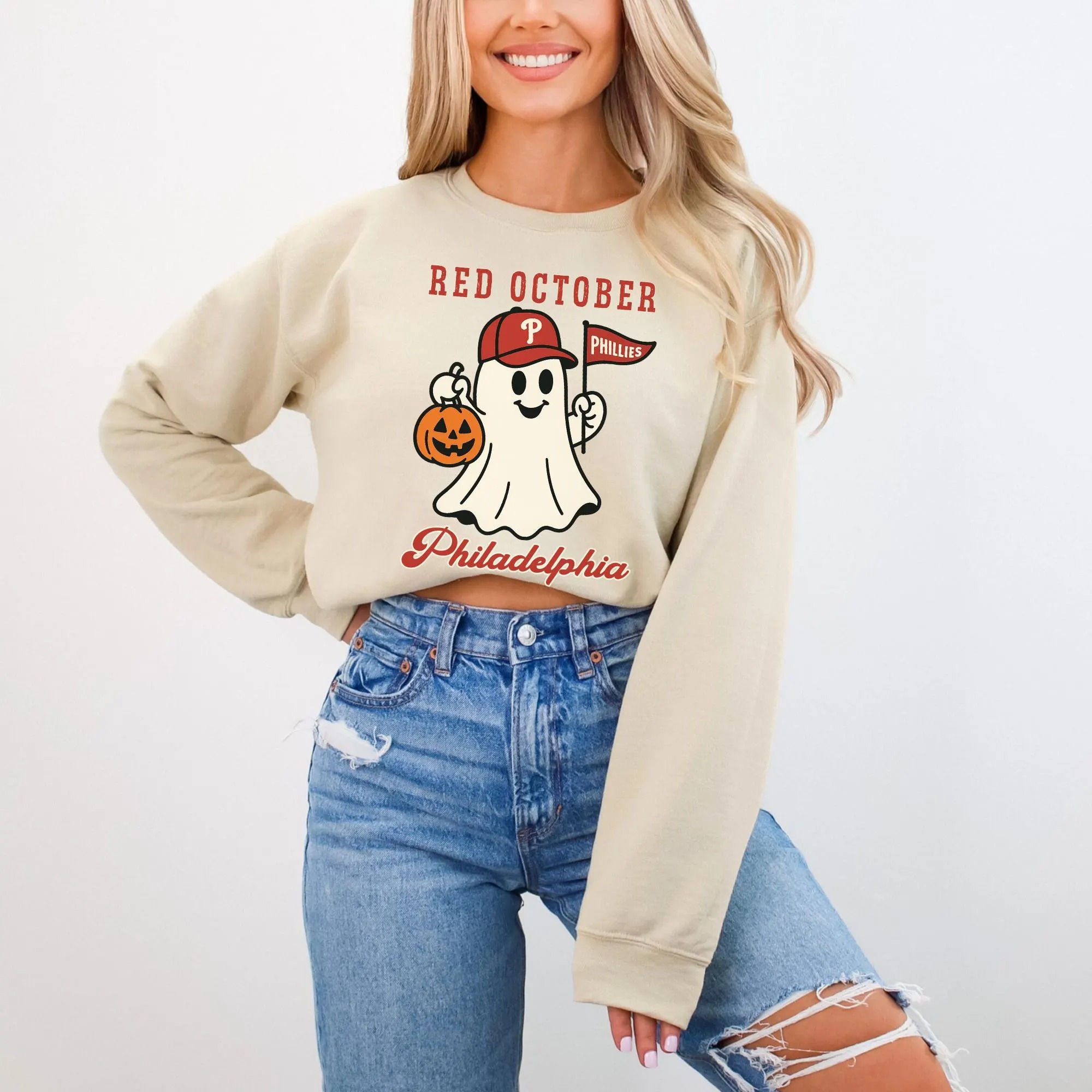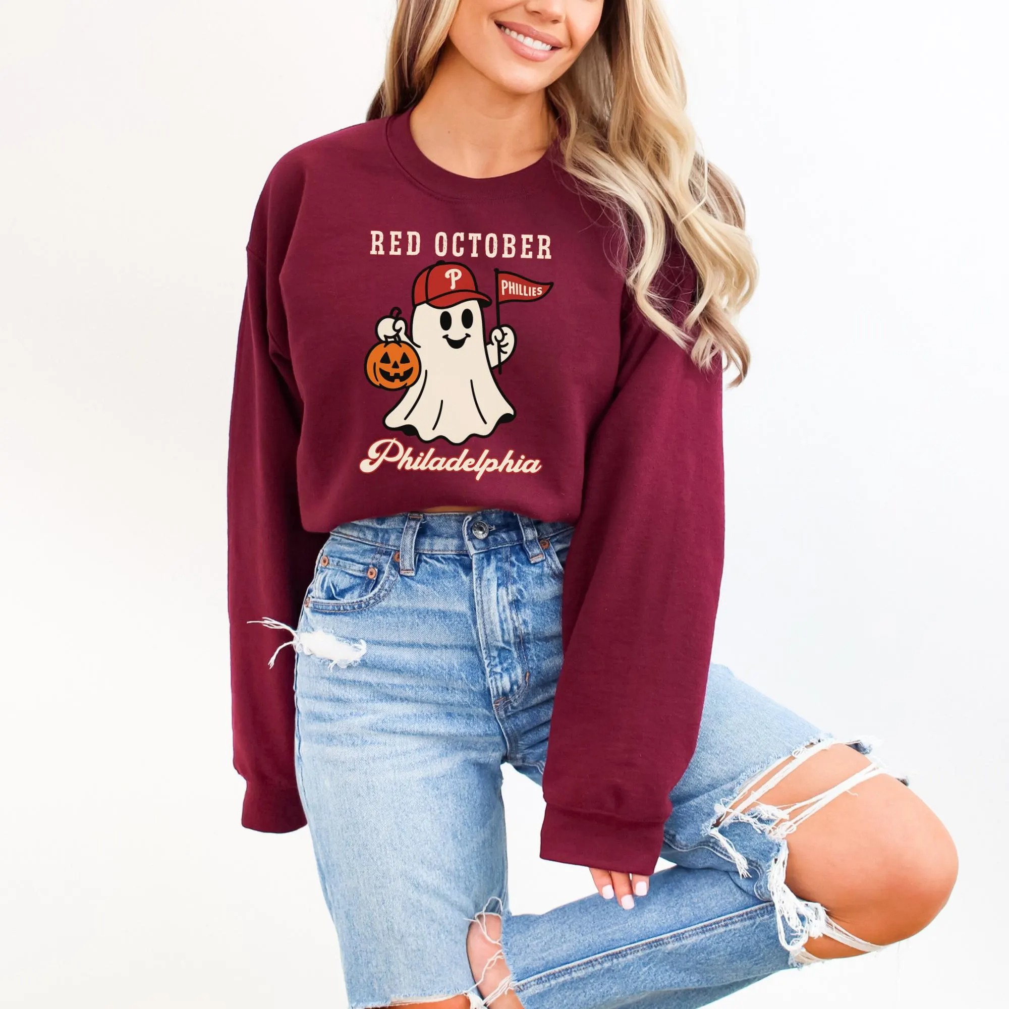 Red October Halloween Ghost Sweatshirt, Spooky Baseball Halloween Sweater, Philadelphia Shirt, Halloween Ghost Philadelphia Hoodie