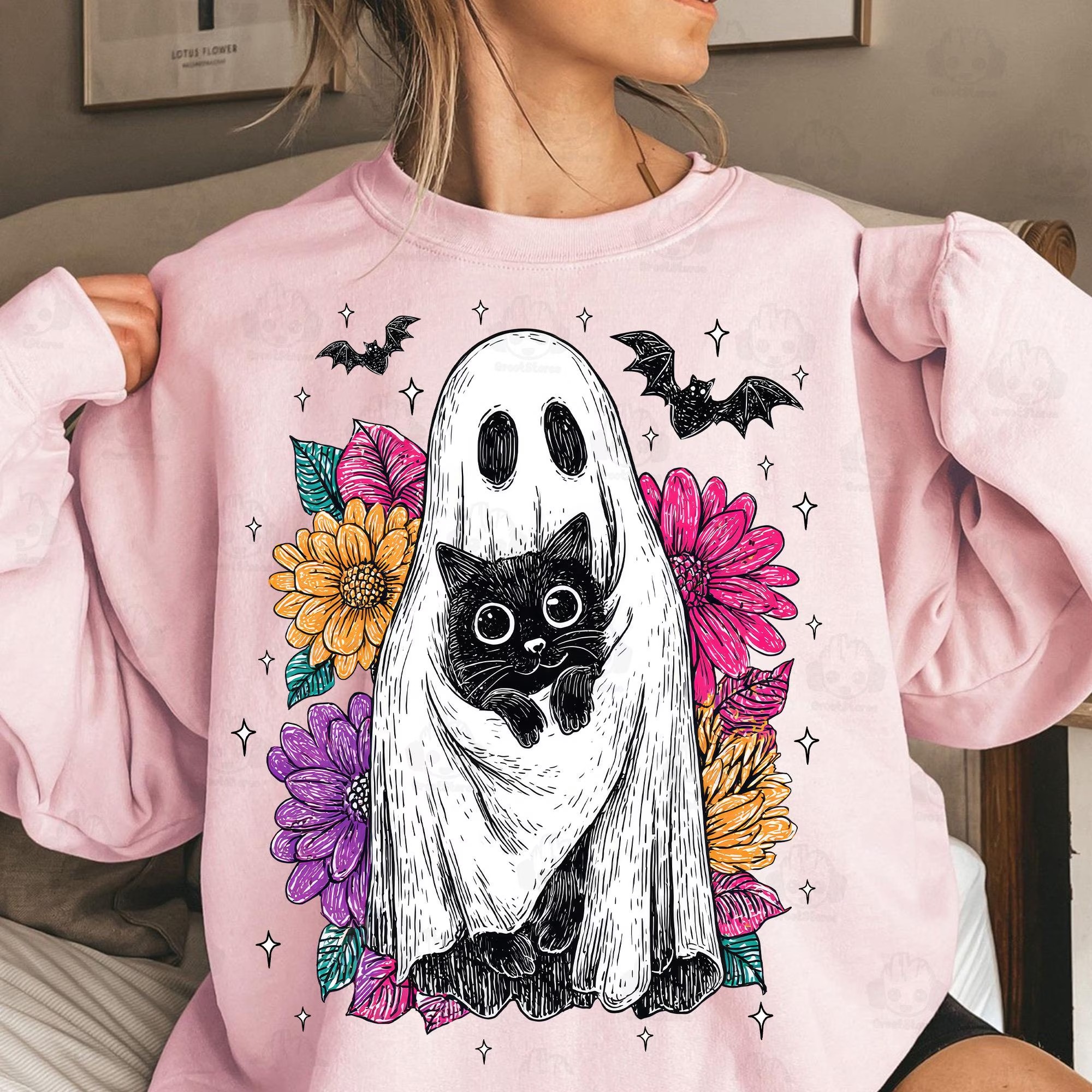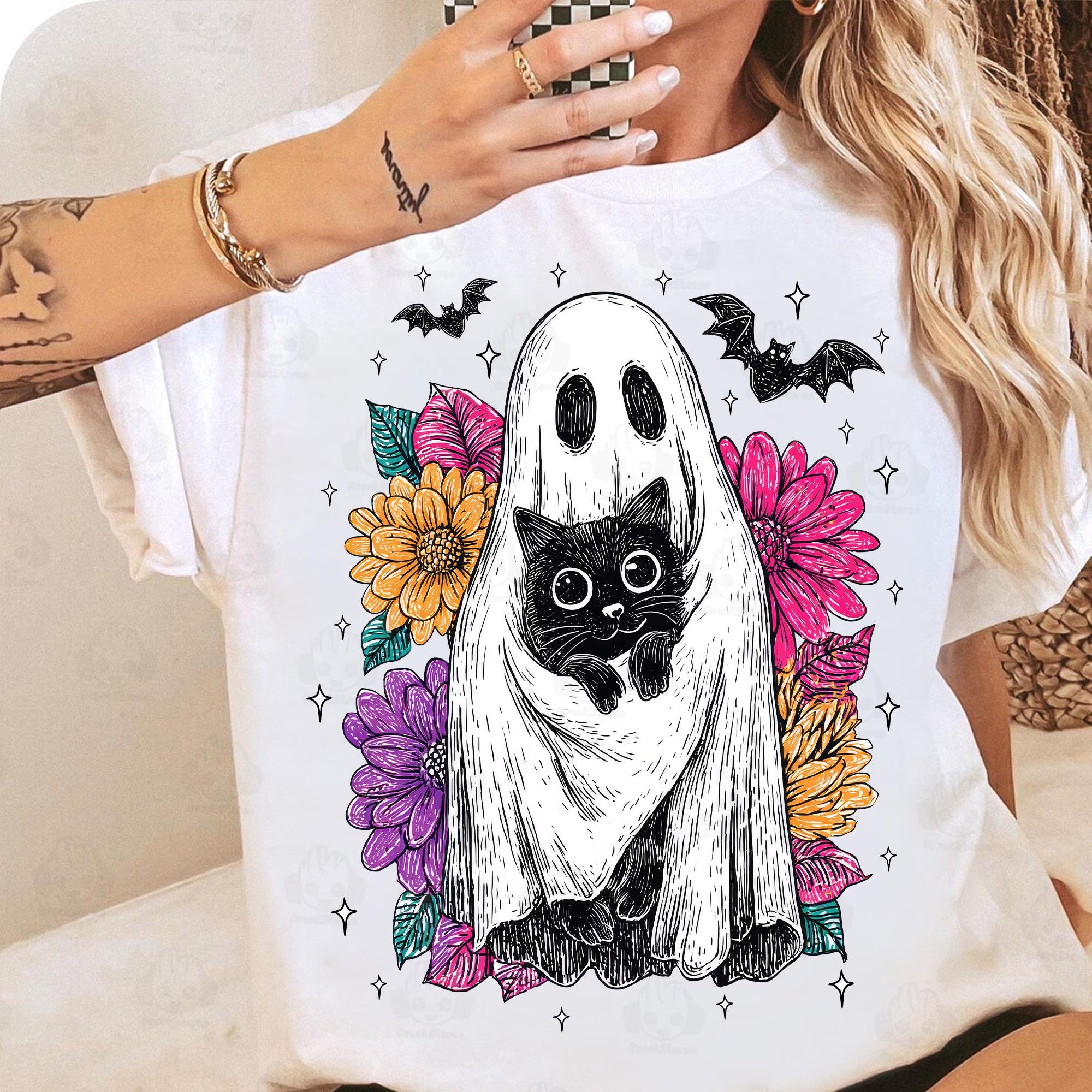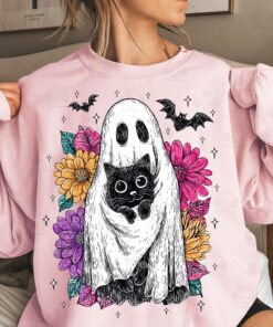 Retro Halloween Ghost And Cat Shirt, Spooky Ghost Shirt, Preppy Floral Halloween Shirt, Boo Halloween Shirt, Funny Halloween Shirt, Black Cat Shirt