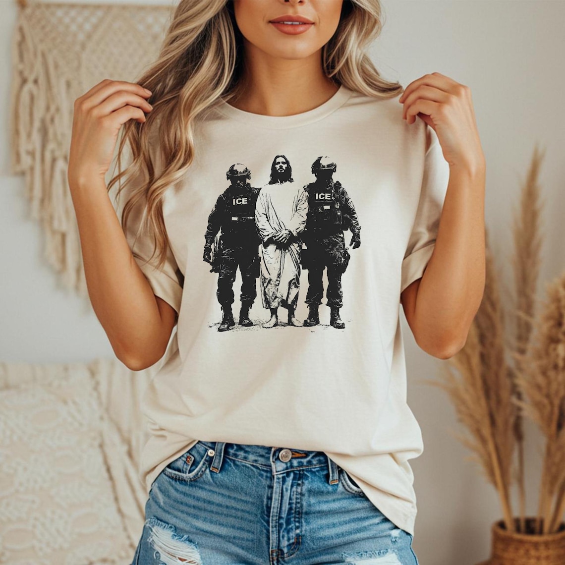 Sarcastic Immigrant Rights T-Shirt, Anti ICE Jesus Arrested Graphic Design