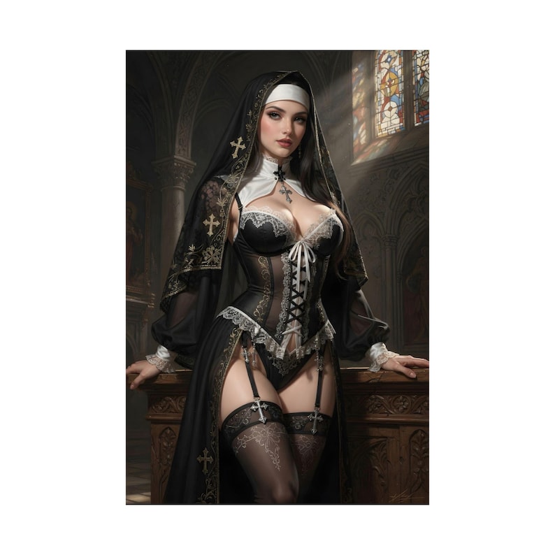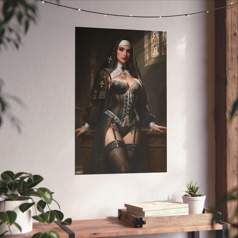 Sexy Gothic Nun Fantasy Art Print, Pinup Anime Poster, Manga Style Wall Decor