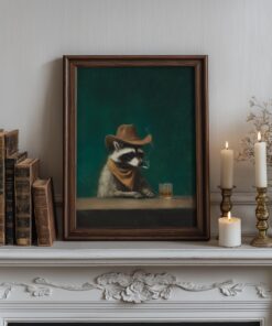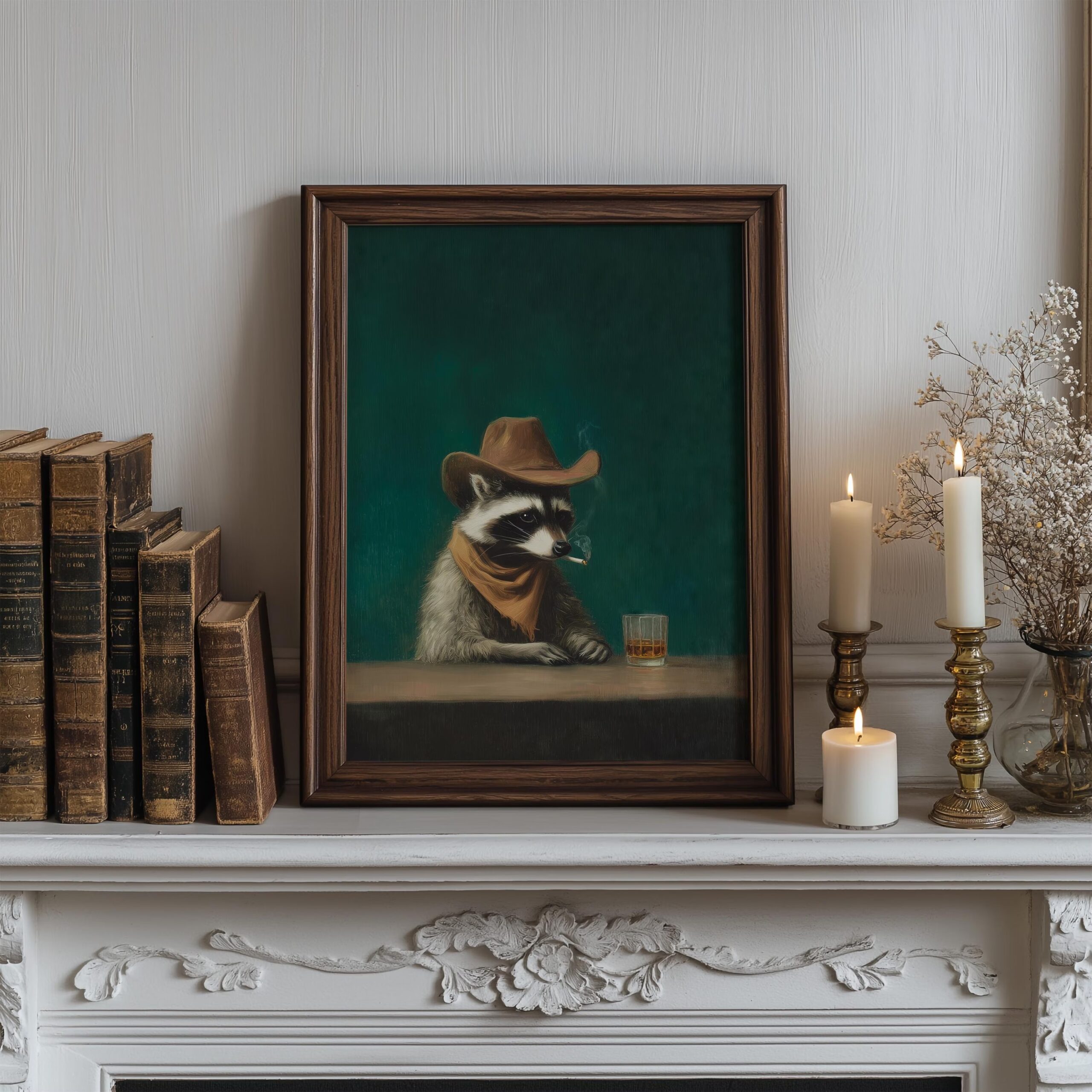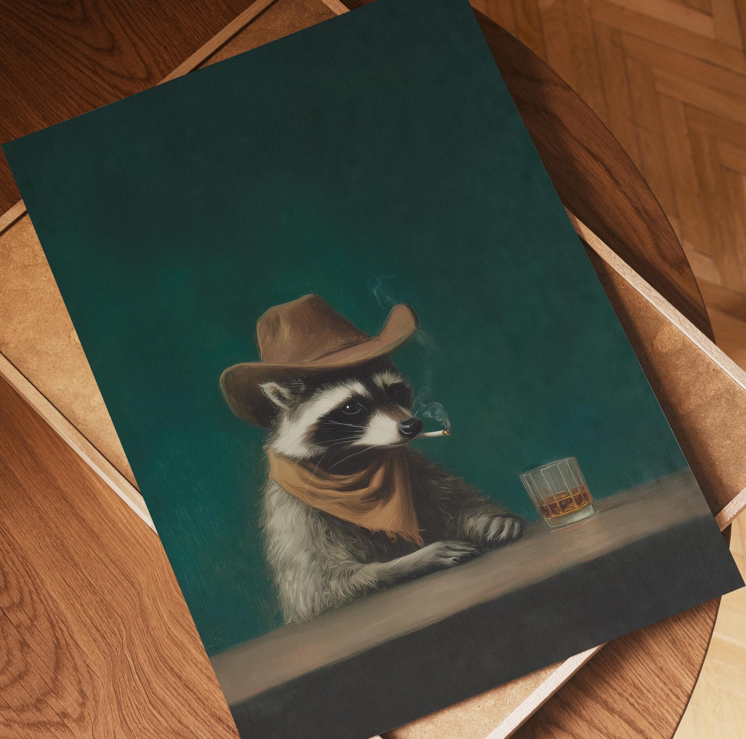 Smoking Raccoon Cowboy Canvas, Vintage Funny Animal Home Decor, Moody Bar Lounge Poster