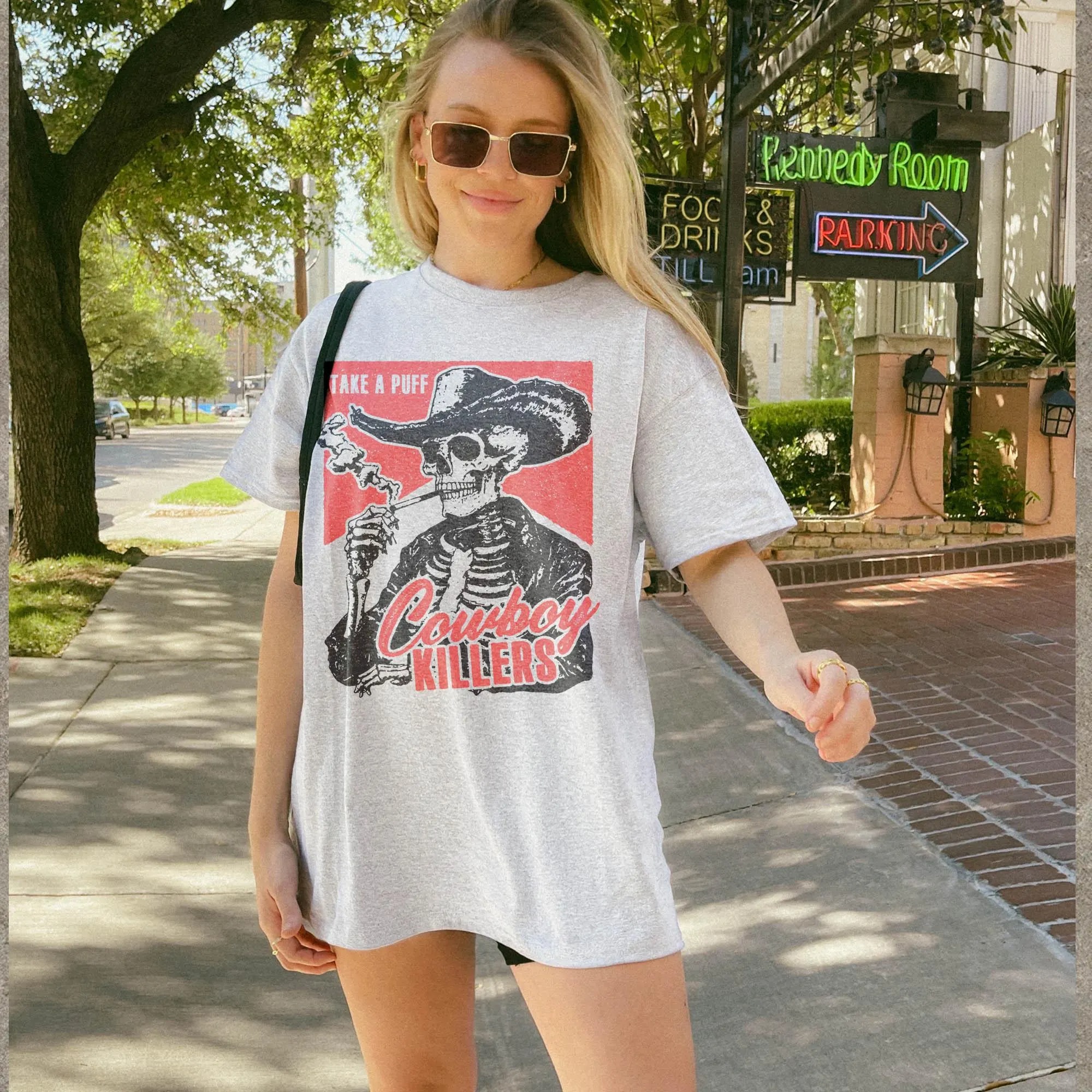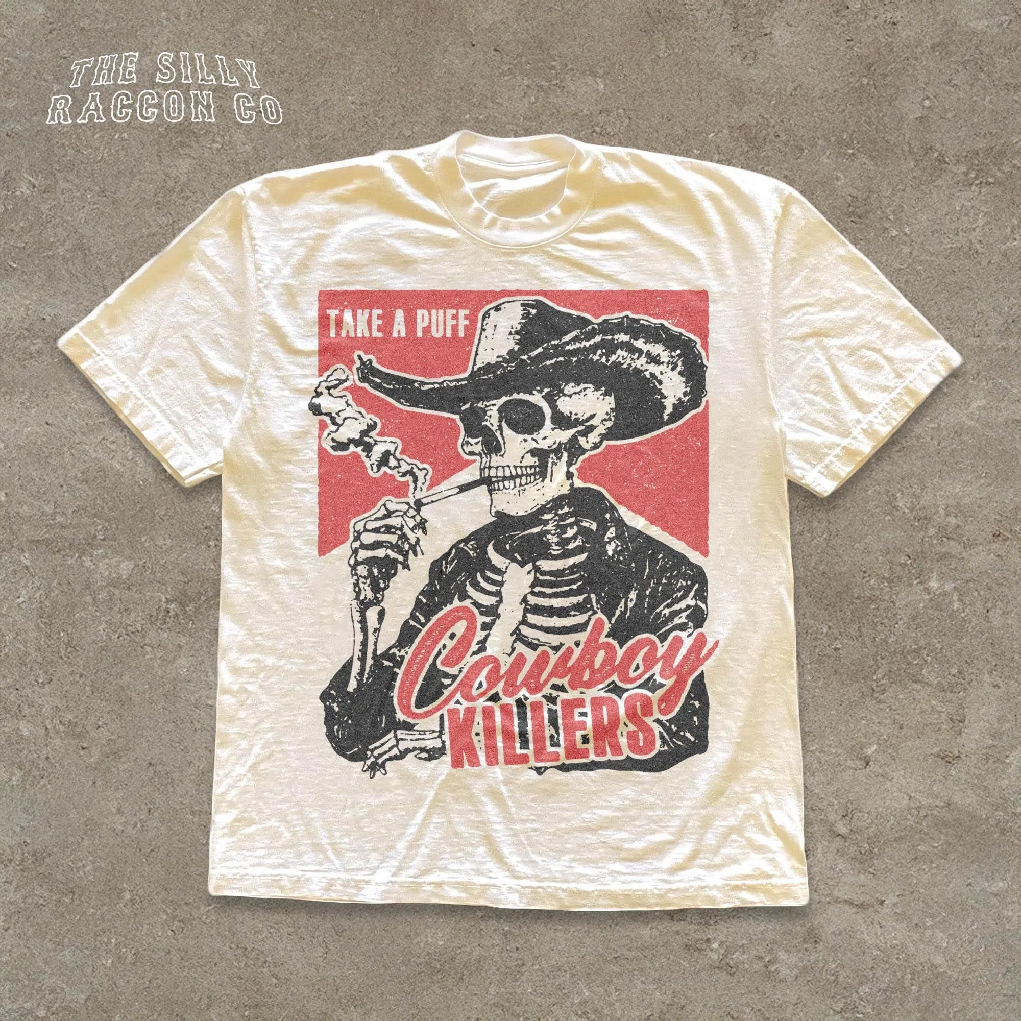 Smoking Skeleton Unisex Adult Tee, Cowboy Killers Shirt, Funny Skull Graphic T-Shirt, Vintage Western Grunge Shirt, Edgy Alt Clothing Gift