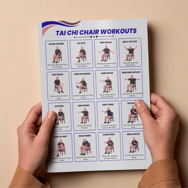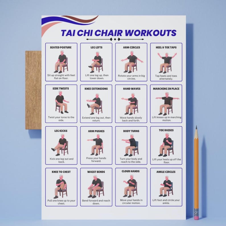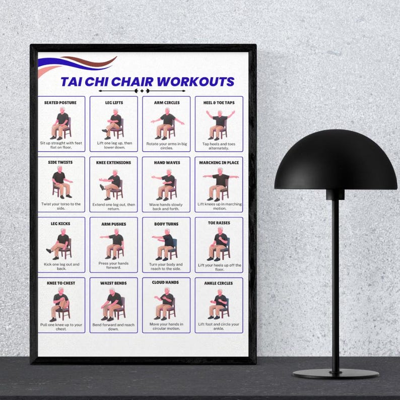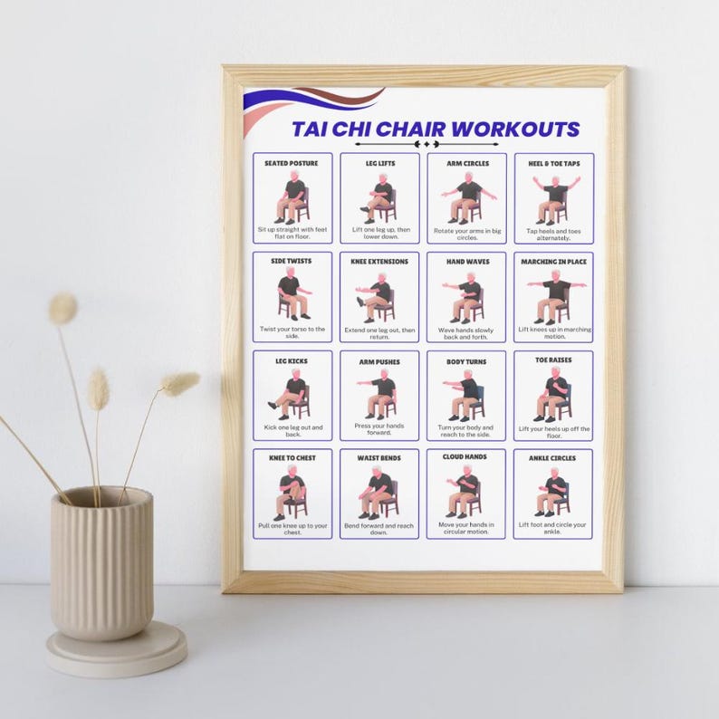 Tai Chi Chair Workouts Poster, Seated Exercise Chart, Low Impact Fitness Art