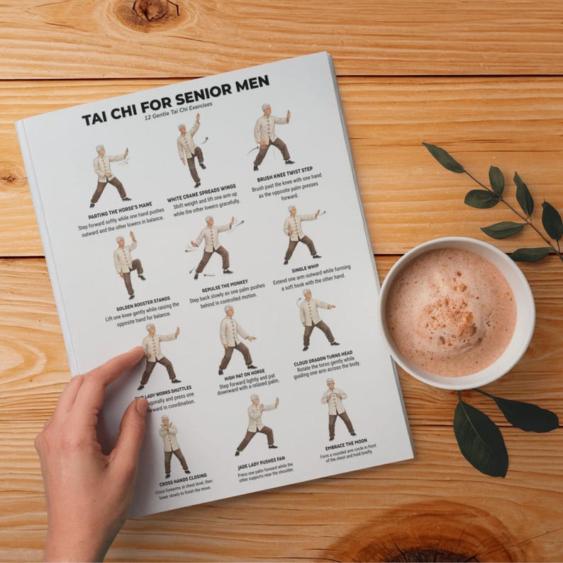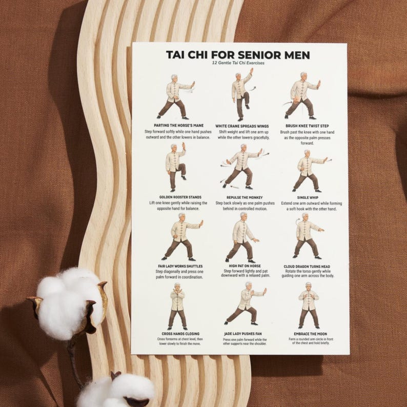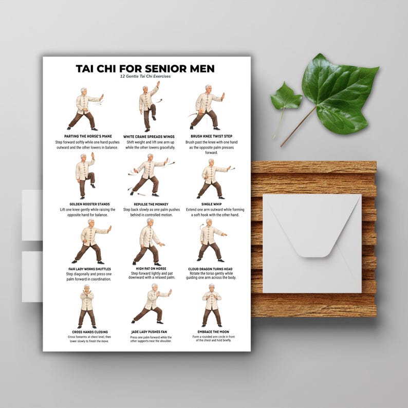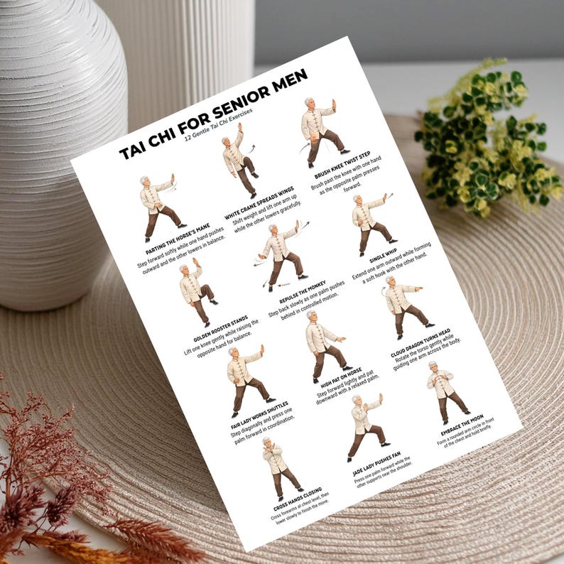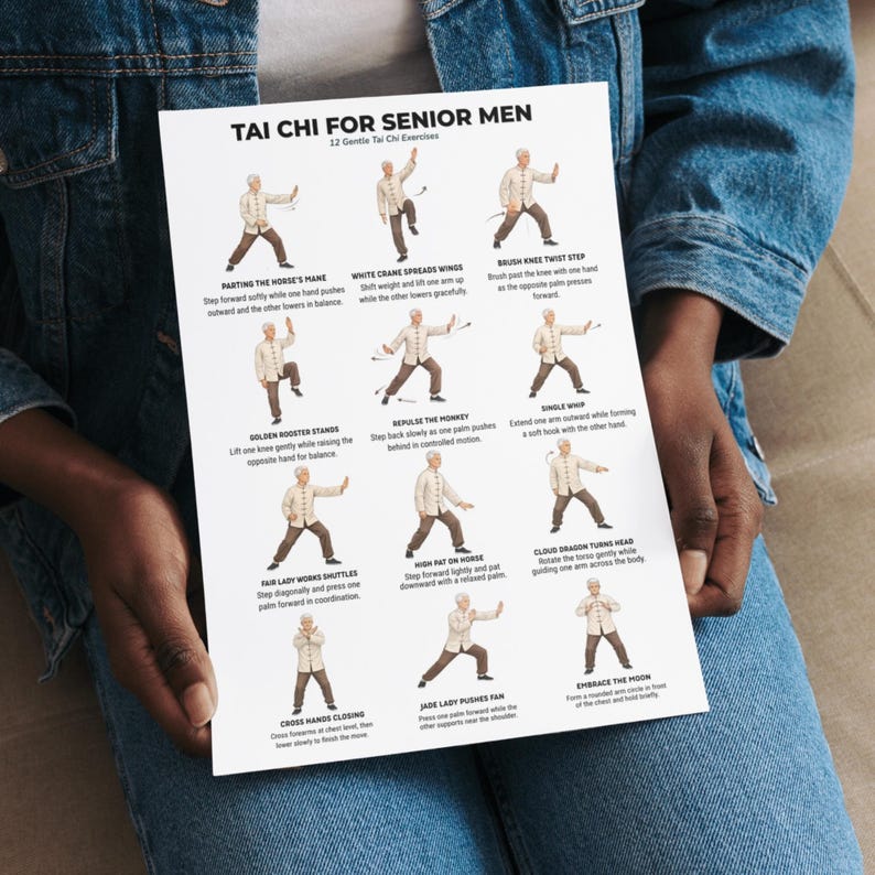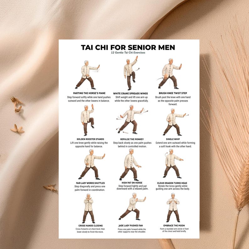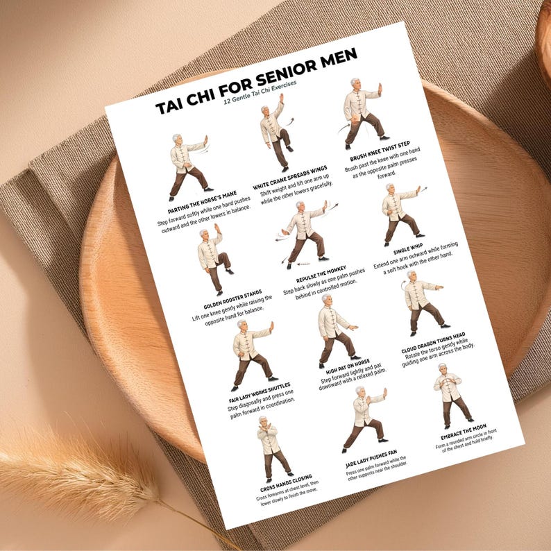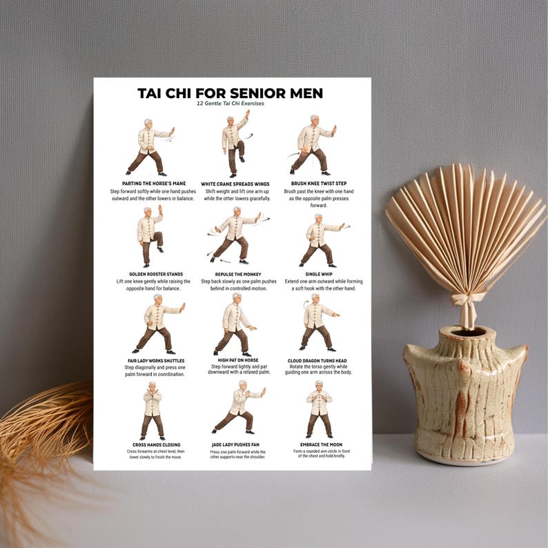 Tai Chi for Senior Men Poster, 12 Essential Exercises Chart, Balance & Mobility Wall Art