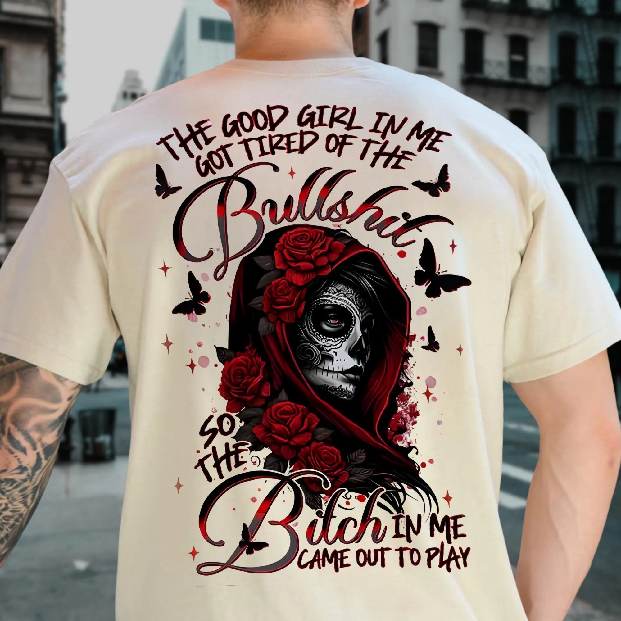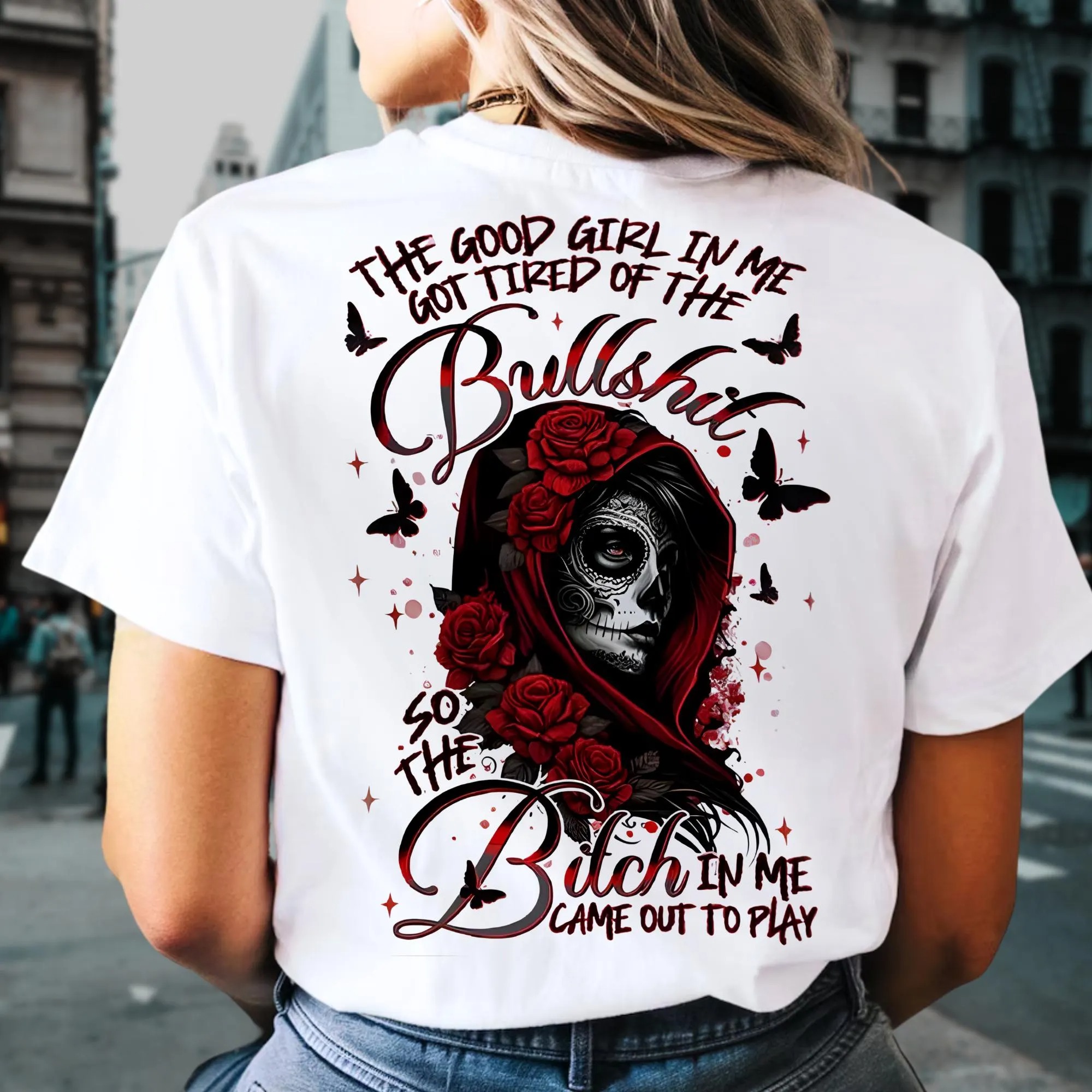 The Good Girl In Me Got Tired Of The Bullshit Graphic Shirt, Skull Tee, Aesthetic Tattoo T-Shirt, Streetwear Style, Retro Y2k Women Graphic Top