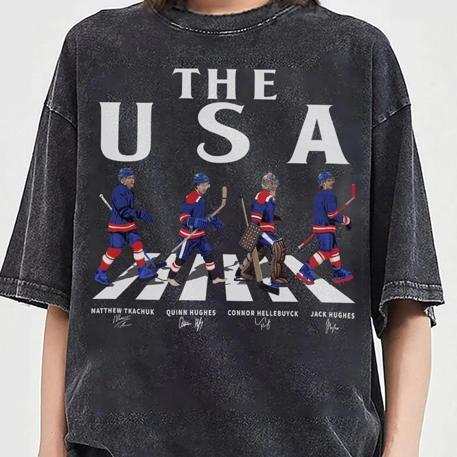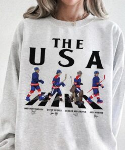 USA Walking Road Signatures Ice Hockey Shirt, Jack Hughes Quinn Hughes Connor Hellebuyck Gift For Fan Hockey Unisex
