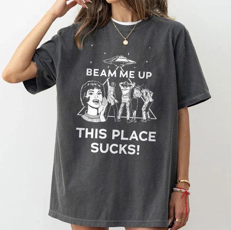 Vintage ‘Beam Me Up, This Place Sucks’ Sweatshirt – Funny Sci-Fi Alien Shirt, Space Humor Tee, Retro Movie Quote Shirts